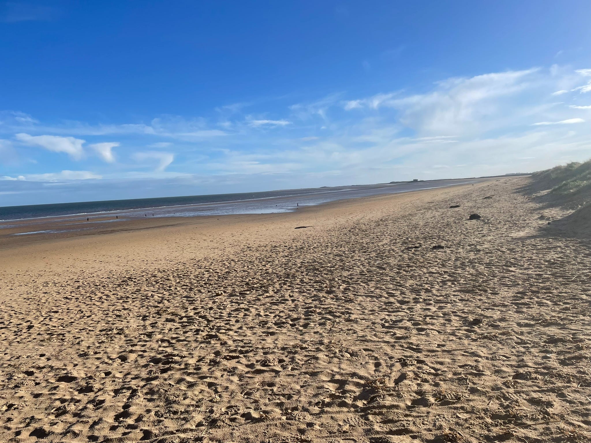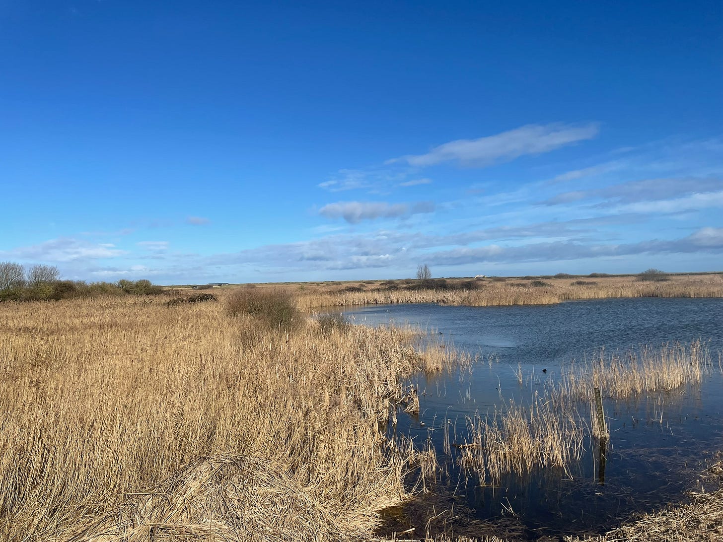 The first truly sunny day, but with a brisk wind to accompany the blue skies and temperatures only a handful of degrees above freezing. However! I’ve been here over a week, and I haven’t seen the sea. Or the salt and fresh marshes. And we have appropriate clothes. So out we head, appropriately layered with windproofs and gloves, hats and scarves.