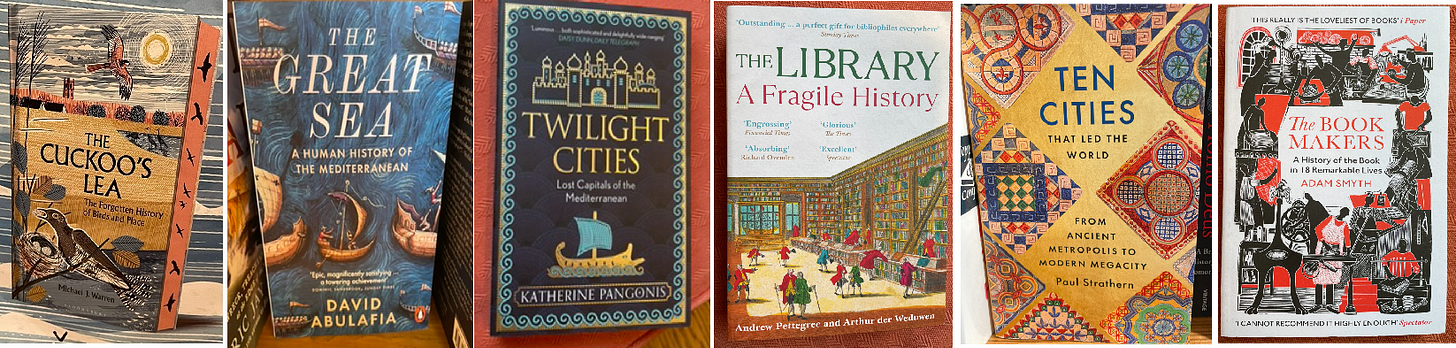 A wet day, so, back to Ely, this time with my husband. We potter around the shops until the rain becomes heavy, and then hide in Topping & Co (an absolutely wonderful bookshop) for a while. I can’t buy books, not ones I would take home, because there just isn’t enough luggage allowance, so I photograph the covers of all the ones that capture my interest. (Well, not ALL — that list would be almost endless — just the ones I think might be useful for the second draft of An Unwise Prince or in its sequel, A Distant Obligation.) I’ll see if my local bookshop in Canada can order them — sadly that’s often not the case with UK published books — and barring that, there’s always Blackwells, who happily ship to Canada with postage included in the price. Here is most of them — one for pure pleasure, the rest for research (which is also pleasure, really).