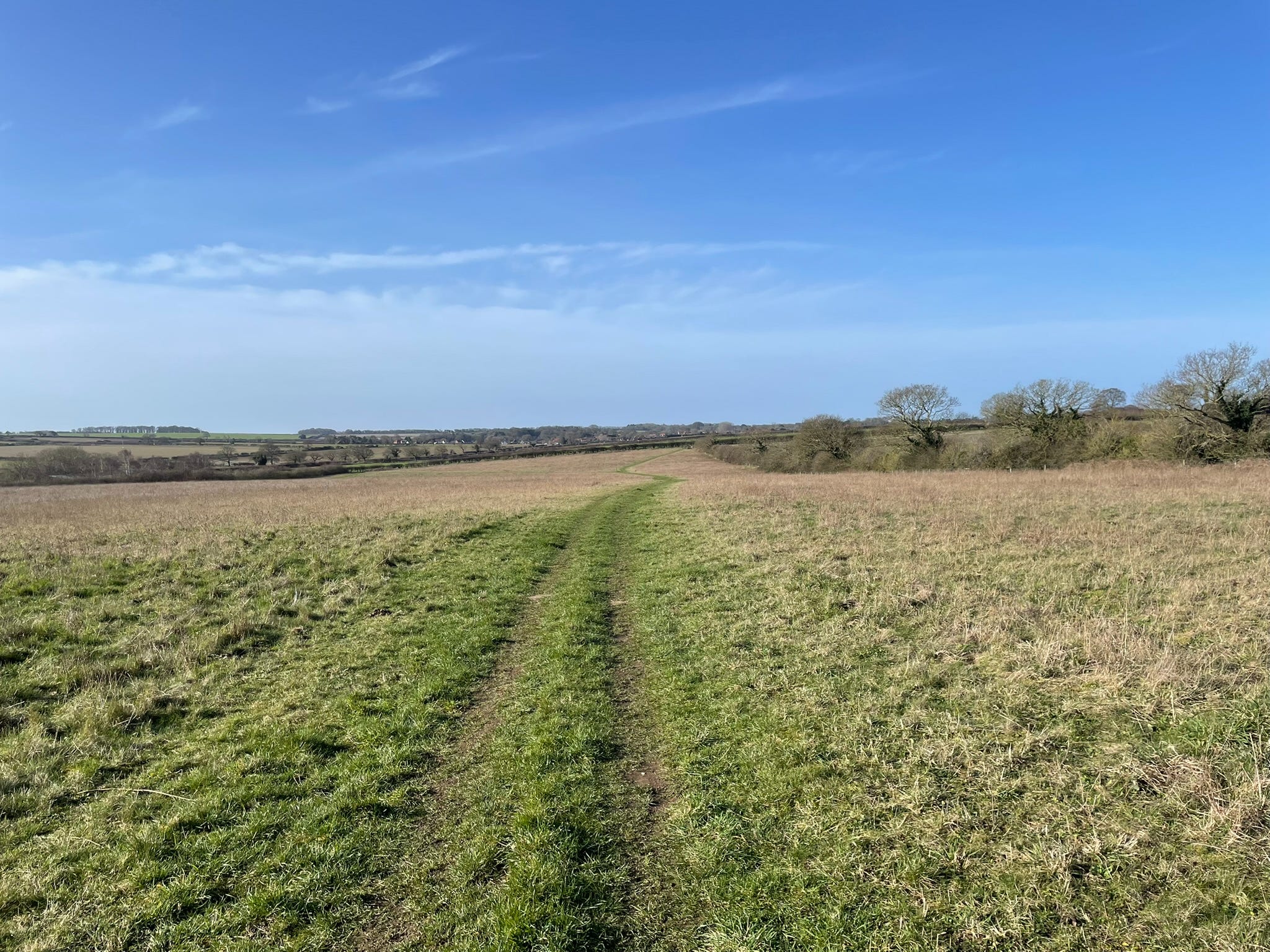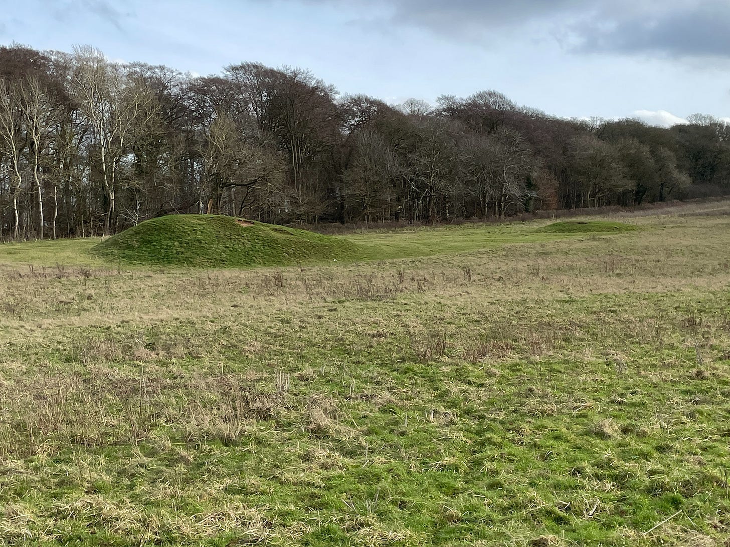 Two of the pasture fields to the east of the Peddars’ Way, an ancient trackway/Roman road that runs across Norfolk from Thetford to Holme-next-the-Sea, hold Bronze Age round barrows; there are more just to the north and west of the track. One — or what remains of it — lies in a small triangular woodland called Anmer Minque, traditionally the site of a battle between Roman soldiers and Boudicca of the Iceni. (There are quite a lot of these ‘traditional battle sites’; take it with a grain of salt.) A barrow a bit further west, in a small copse known as Paston’s Clump3, reputedly was used as an Anglo-Saxon moot hill. Layers of history here: prehistoric, Roman-era, Anglo-Saxon, medieval.