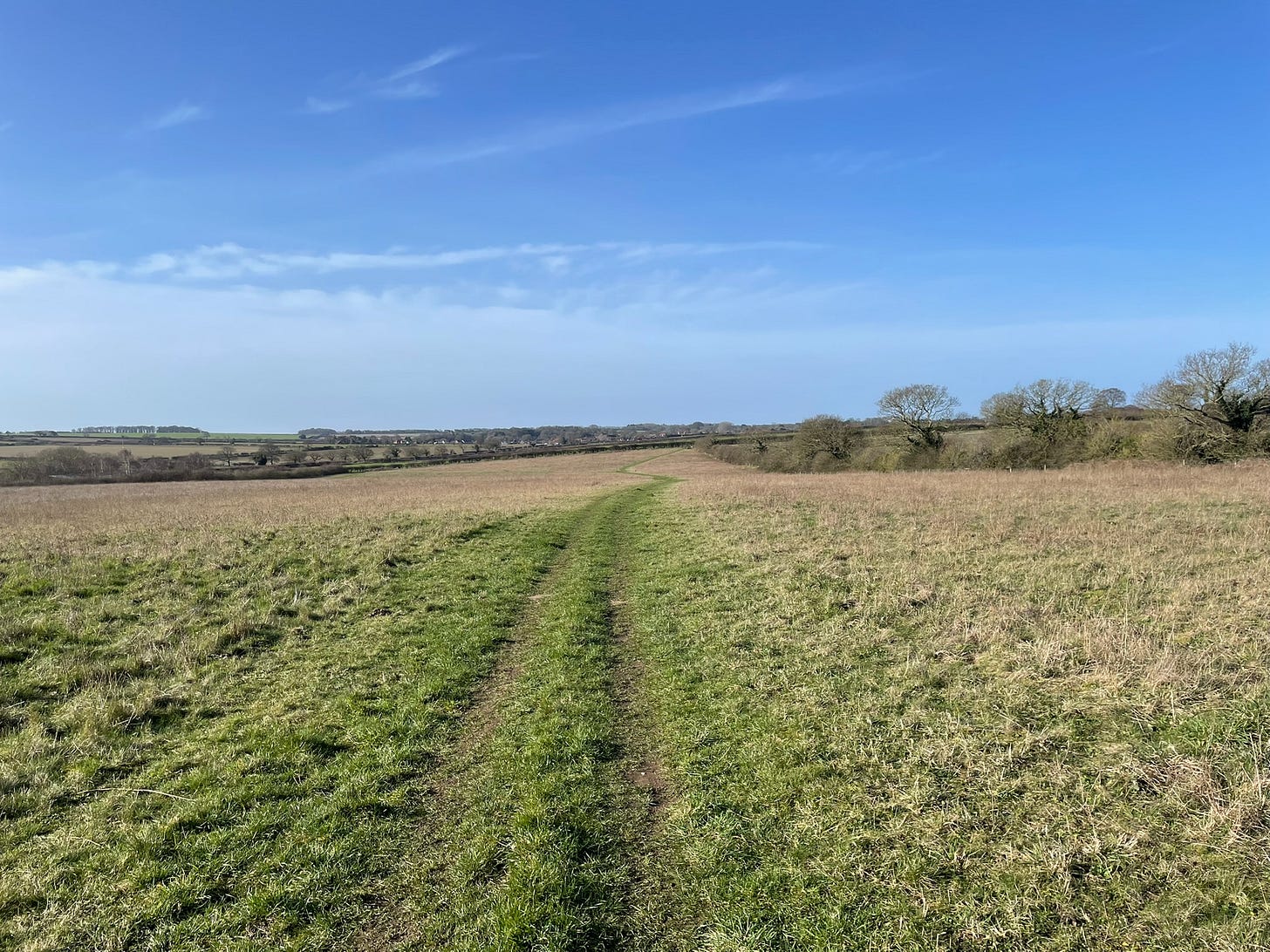 We spend just under three hours here. Lark song accompanies us through most of the walk; in the woodland sections, tits — long-tailed, blue, great — call. A lone fieldfare is perched in an oak tree. Hares bound across the fields, and a colony of rabbits huddles near a fenceline. We talk sporadically, about plot tangles, about the birds, about what we can see.