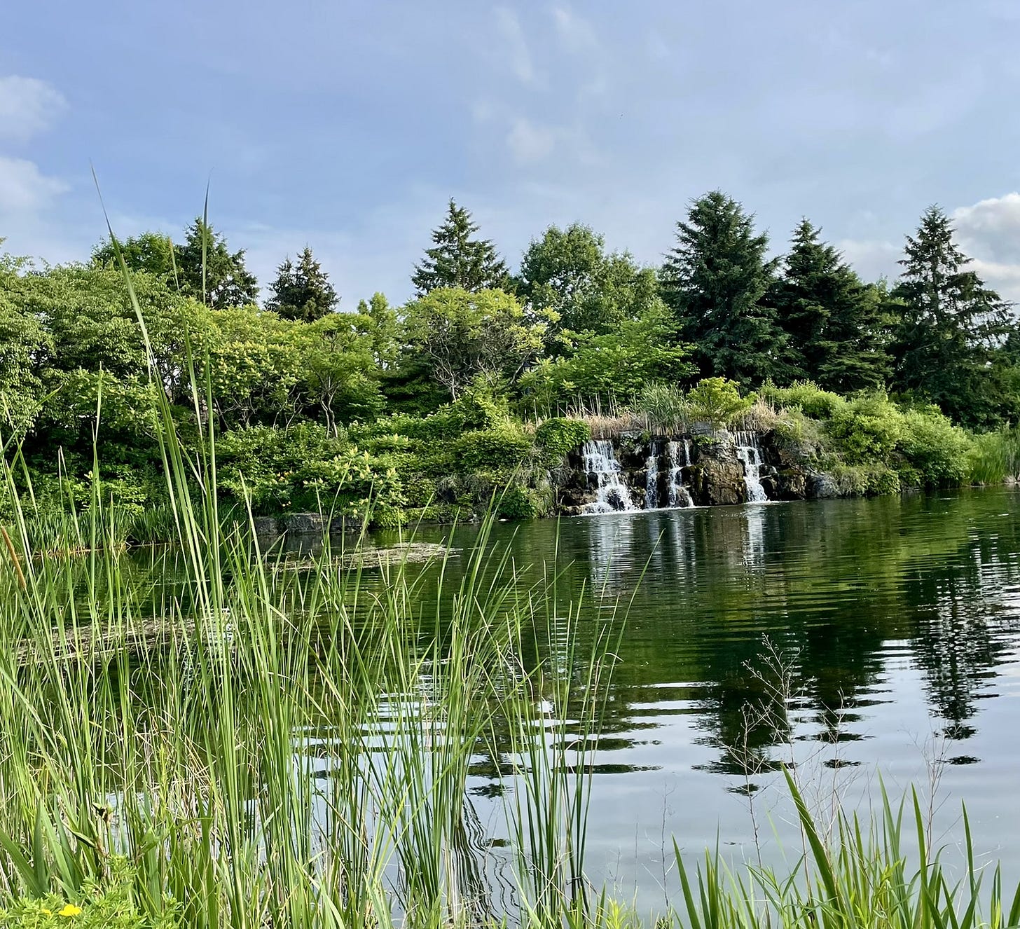 It’s been a week of meetings, appointments, events — and between those and the weather, I’ve had little chance to go walking or biking, or to write. Yesterday evening, after supper, I walked down to the man-made ponds a short distance from our house. Constructed to gather run-off from roofs and streets via a series of underground pipes, and semi-naturalized (the westernmost one is almost fully so), they are a peaceful place to wander or sit.