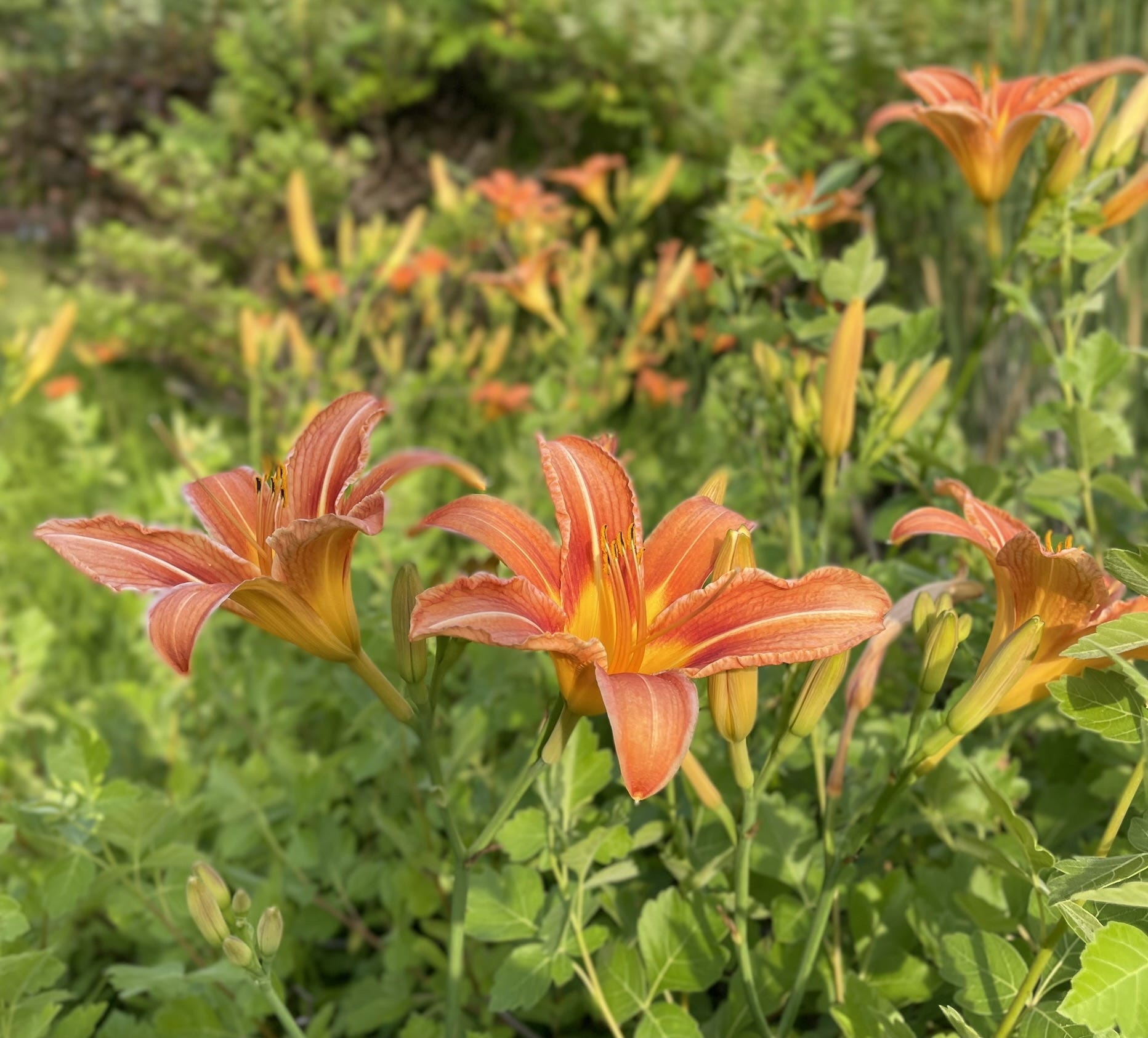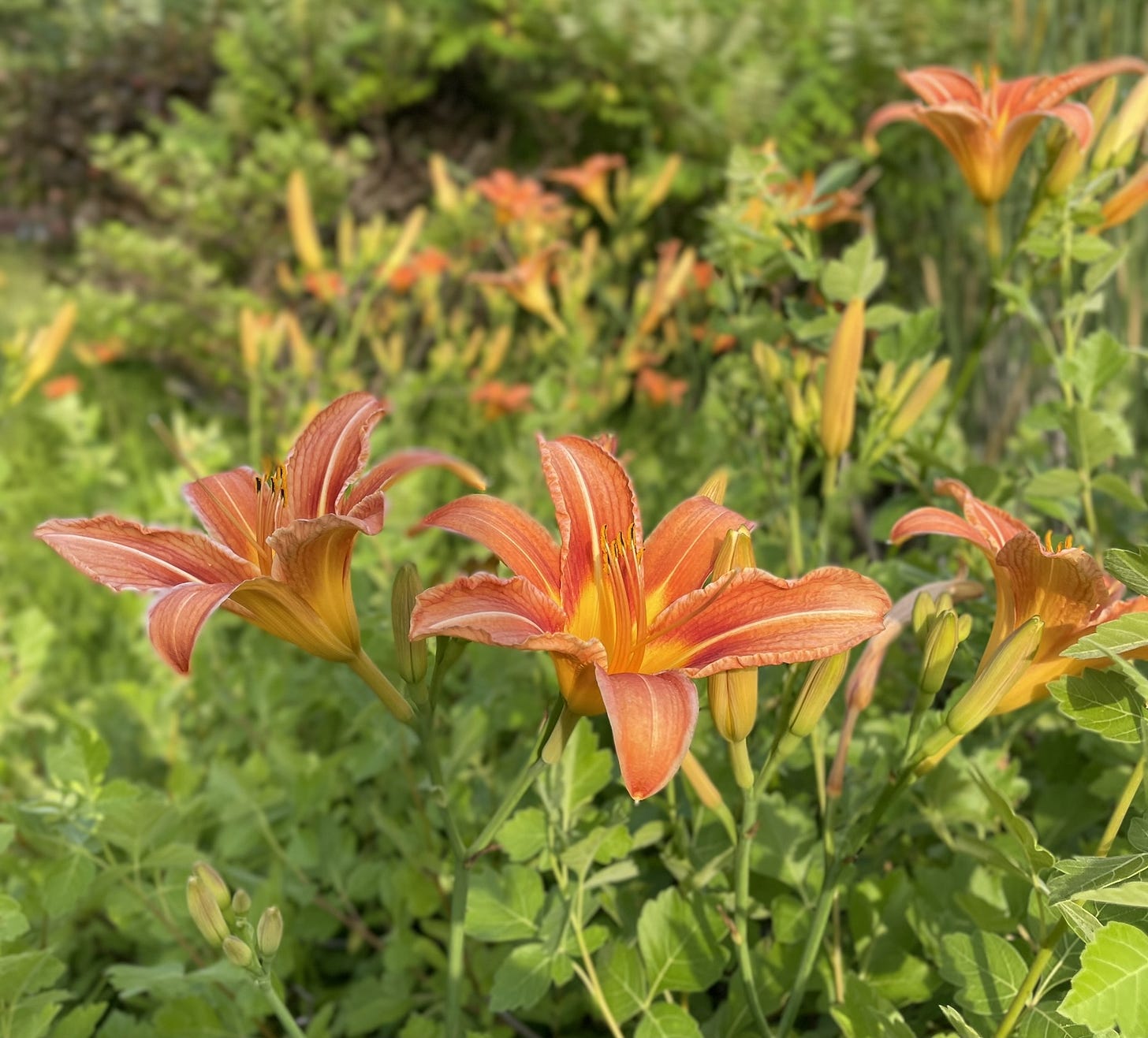A great blue heron stood motionless among the reeds; a kingfisher rattled as it flew up to a tree top. Concentric ripples pocked the surface of the water: fish rising, or water insects, or both. Orange day lilies brightened the sunny banks; blue wild geraniums softened the shady edges.