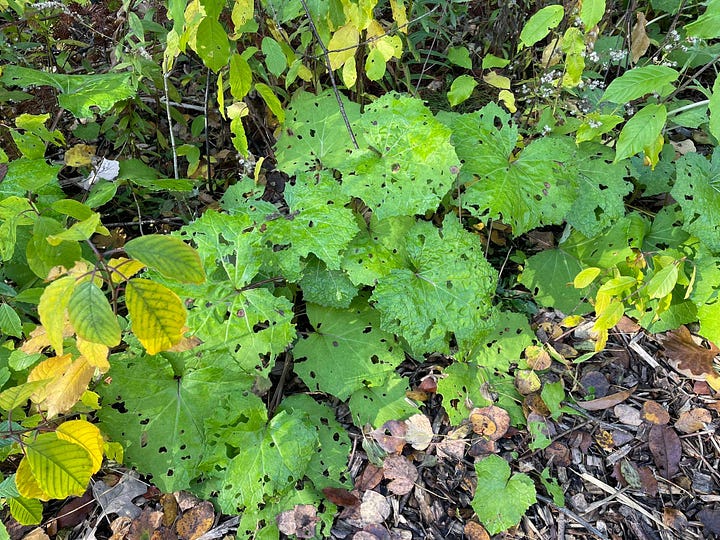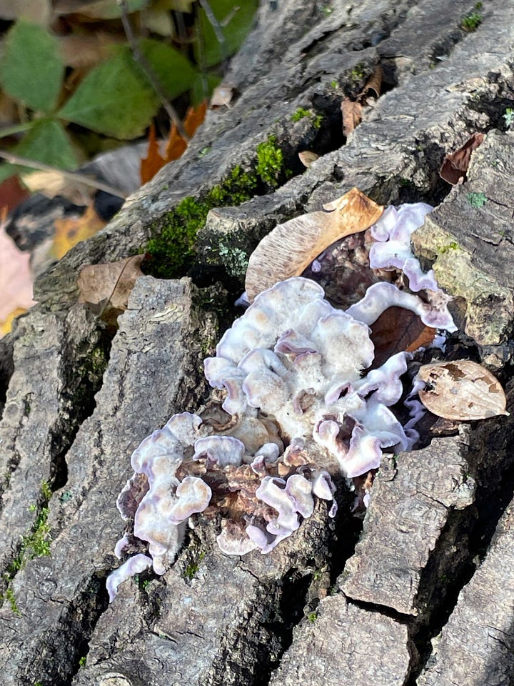 But low and close gives me something new: a purple fungus. I’m guessing it’s Chondrostereum purpureum, silver leaf fungus, but I can’t be sure. Along the same path where I find the fungus, there are patches of bright green vegetation, a low, lobed-leaved plant still untouched by frost or cold, its chlorophyll production increased to take advantage of the light now reaching the forest floor. Energy production goes on until the last possible minute, because this is Tussilago farfara, coltsfoot, the earliest of spring flowers. In early April, bright yellow flowers will line this path. It’s not native to North America, brought by early European settlers probably for its medicinal properties. Something likes it, though: the leaves are well chewed.