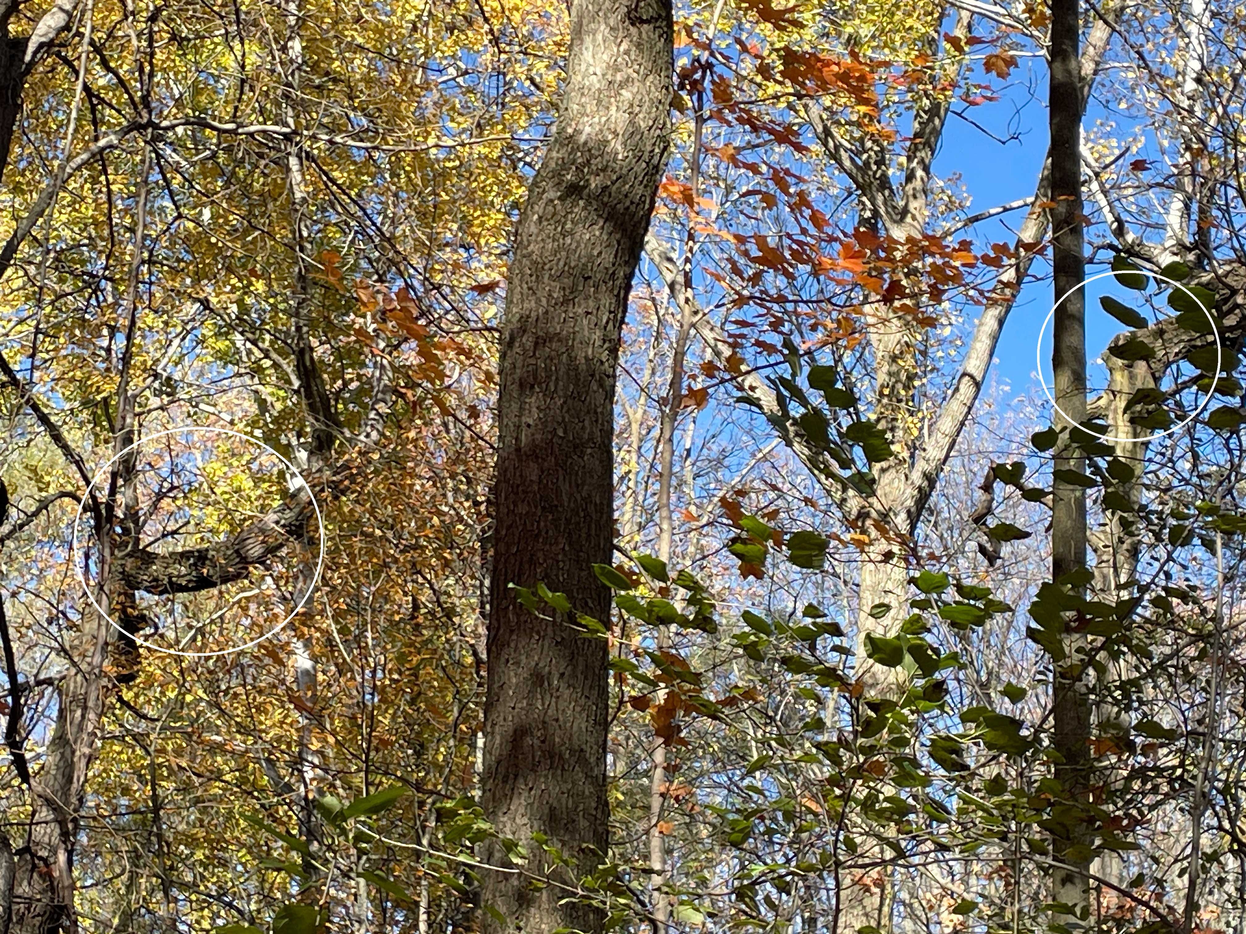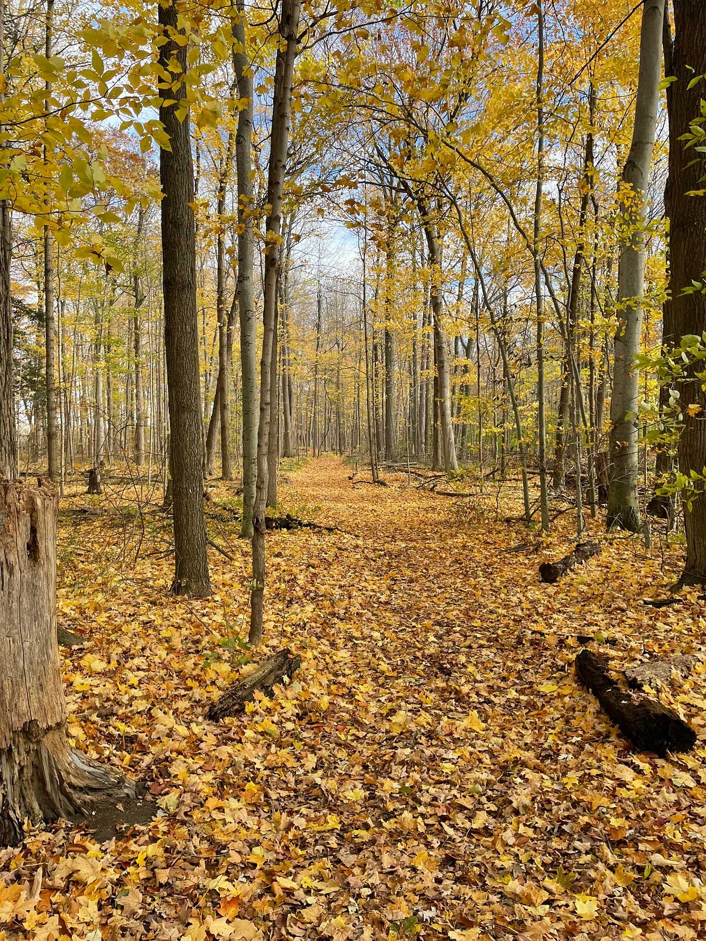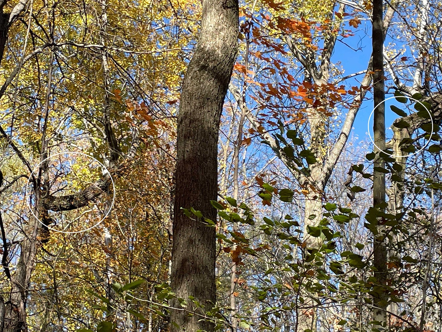 More hidden things are being revealed: an old gate amidst a tangle of grasses and grapevine and goldenrod; the swamp that’s not visible through underbrush in the summer; the U-bends in the trunks of two trees that shows where a third tree fell on them, probably decades past when they were little more than saplings.