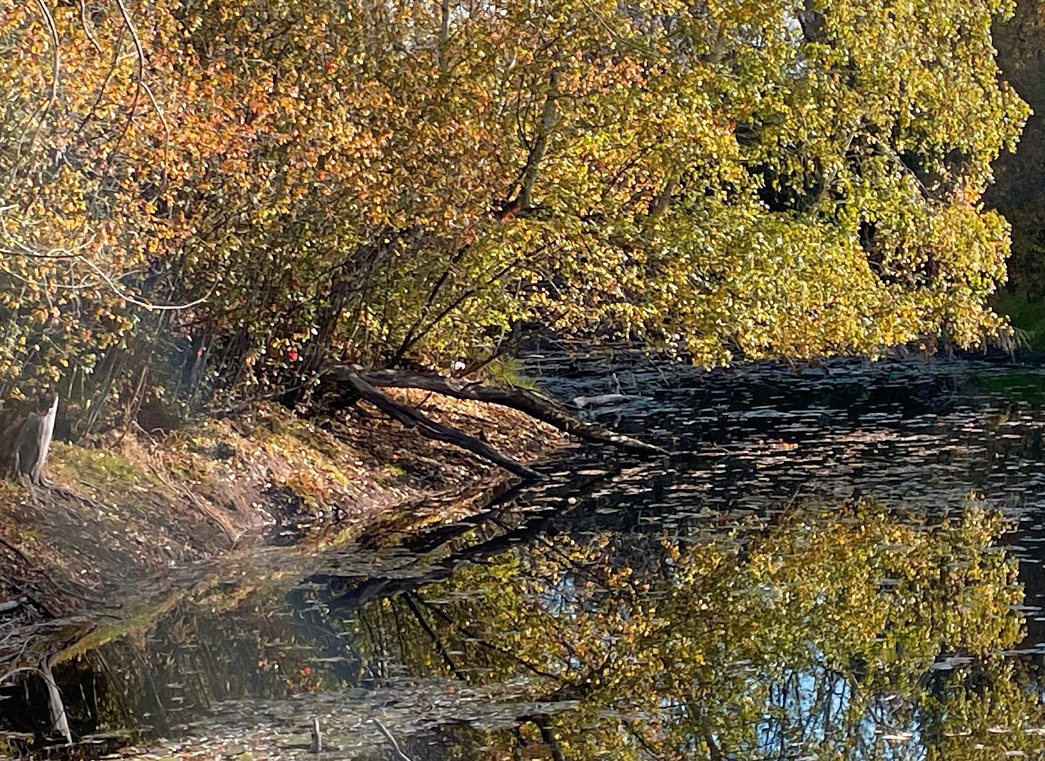 At the beaver pond, the low sun makes a Klimt painting of the trees and water. Just over seven weeks to the winter solstice, the hours in which the sun isn’t in my eyes for part of my walks are shrinking. Birds are often only silhouettes. More reason to look low and close, but that’s still mostly something I’m learning to do. My nature, my default, is for long views, the big picture. I’d have never made a finds archaeologist; I’d have been out there with maps and aerial photographs and LIDAR, looking for trackways and boundaries and ring ditches.